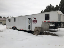 41-foot United 5th Wheel Transport Trailer, built for small and medium sized animals. This heavy-duty trailer is designed for safe and reliable animal transport. It also has functional living space with: double bed, propane heater and refrigerator, microwave, table w/chairs, sink with storage, water bladder system and air conditioning. The electrical system is a combination 110/240 volt and 12 volt. In excellent condition, low miles.