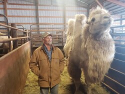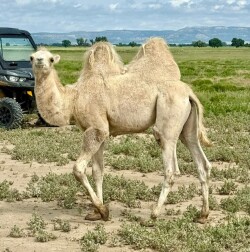 3 male bactrian camels - $12,000->18,000 – All three are mother raised They have very nice humps and straight legs. Father is a large (2100 lbs), white Bactrian with great humps and very correct. Sire is pictured for your reference standing next to Cody Deines. We are located in Northeastern New Mexico but can potentially help with hauling. Give us a call – Cody Deines (505) 918-8863.
