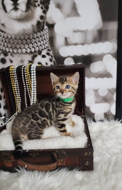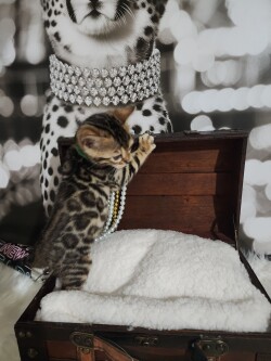 Beautiful show/ breeder quality warm brown female with tri-color rosettes with perfect flow to her pattern, short ears high on head spaced perfectly, high contrast,lots of gold glitter throughout her velvety soft luxurious coat!! Available to loving home as a high end pet or to a Registered cattery for breeding and show prospect. Beauty is now available to reserve with a deposit.