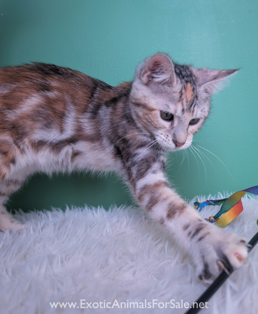 Adorable baby girl! Bold markings, tiny ears, poofy whisker pads, and a very even flow to her pattern. Very sweet dispostion and loves cuddle time. We set aside playtime each and every day to develop a strong bond with our babies. Regular playtim...