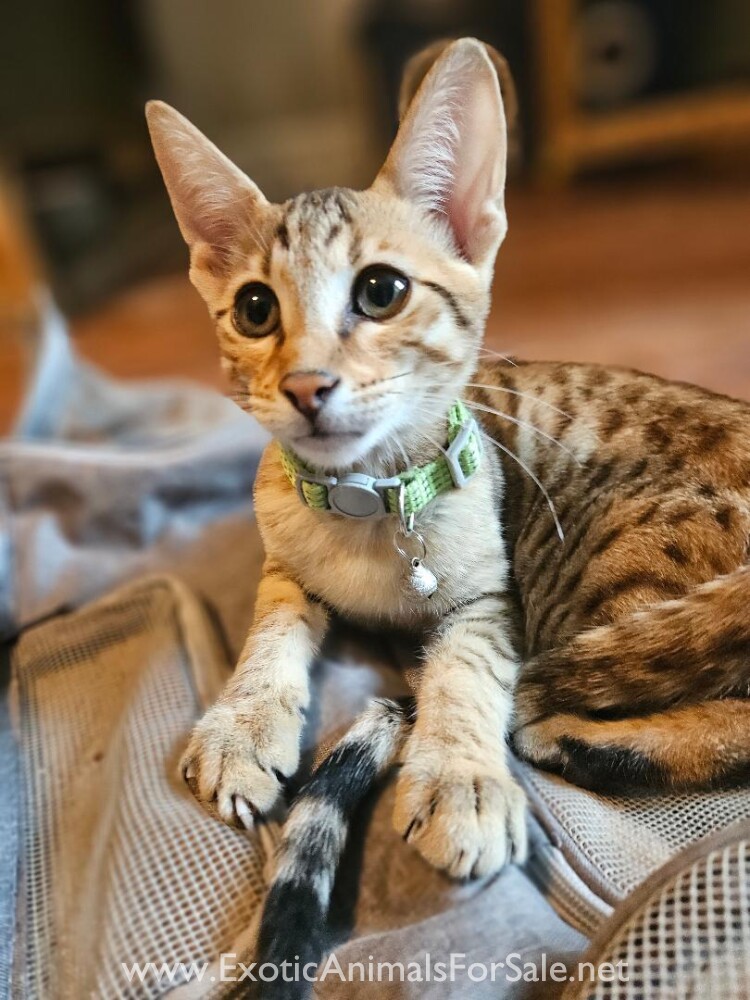 Savannah F2 girl D.O.B. 5-24-24. this girl is beautifully marked large ears and long legs. My sister attempted to use her in a breathing program but she is wanting to get out of the program so she is intact has not had any kittens. She’s got a very s...