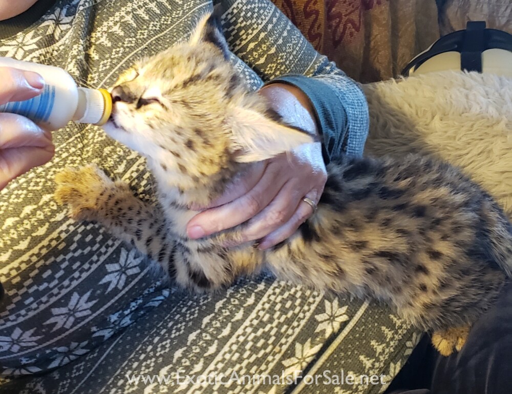1 month old female serval. She would be an amazing addition to an ambassador program. Drinking a bottle beautifully multiple times a day. USDA licensed facility. Text with any other questions.