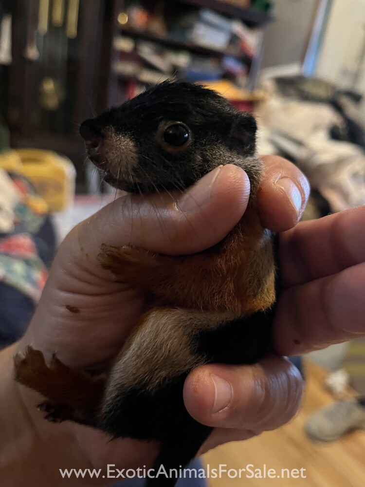 Baby male Prevost's squirrel for sale. Hand fed from before eyes were open, super tame. People are all he has known. He is about 5 weeks old now and will be ready for his new home in a few weeks.