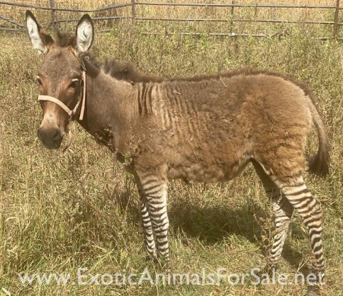 A zedonk is hybrid produced from mating a donkey sire with a zebra dam. While some variation on markings occurs, it is common for zedonks to have brown bodies with black and white striped legs. A few naturally-occurring zedonk cross-breeds have been found but most are produced inorganically as humans facilitate the mating of the two species.